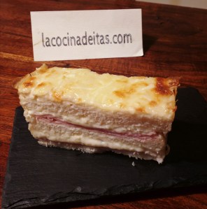 - Pon el jamón York encima, añade una capa de bechamel, pon otra capa de pan de molde, una nueva de jamón York, otra de bechamel, una última de pan de molde y remata con la bechamel que te quede. Pon encima queso rallado.