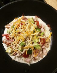 - En sartén con un toque de aceite, doramos una tortilla, agregamos un poco de queso, el pollo desmenuzado, 8 mitades de tomate y una cuarta parte de los trozos de aguacate.