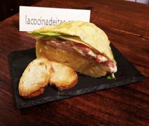 - Batir dos huevos, y ponerles una pizca de sal. En una sartén antiadherente, un poco más grande que la que hemos usado para la tortilla de patata, hacer una tortilla tipo crêpe, es decir, dejando que cuaje por un lado para luego darle la vuelta con un plato para que quede un círculo perfecto.