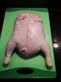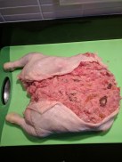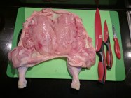 Limpiar bien el pollo y deshuesar por la parte trasera o bien pedir que lo deshuesen en la carnicería, dejando solo el hueso de los muslos.