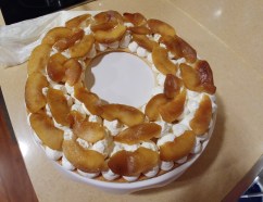 - Colocar una lámina de hojaldre en la base de una fuente de servir, cubrir con crema de mascarpone haciendo montoncitos y, sobre la crema, extender láminas de manzana caramelizada. Repetir la operación dos veces más, pero terminando con una capa de crema de mascarpone.