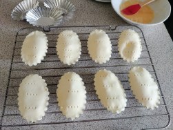 - Pincelar con mantequilla unos moldes adecuados, especiales para agujas (alargados y con los bordes ondulados). Poner el hojaldre, sin estirar y pincharlo. Rellenar cada molde con el relleno frío, pincelar el borde con huevo batido los bordes y tapar con hojaldre (pinchar también).